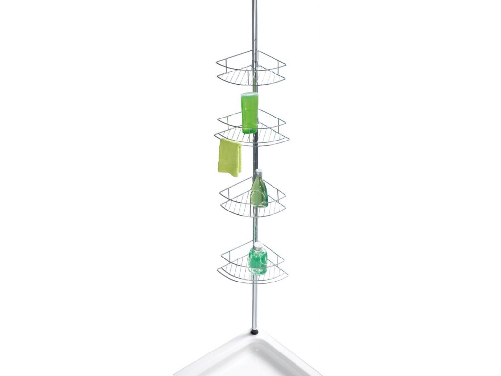 Praktický rohový stojan z nehrdzavejúcej ocele so štyrmi malými drôtenými košíkmi ponúka veľa možností na uloženie šampónu, sprchového gélu, mydla, špongie a ďalších kúpeľňových potrieb. Dva koše majú dodatočný držiak na uloženie flanelov atď.